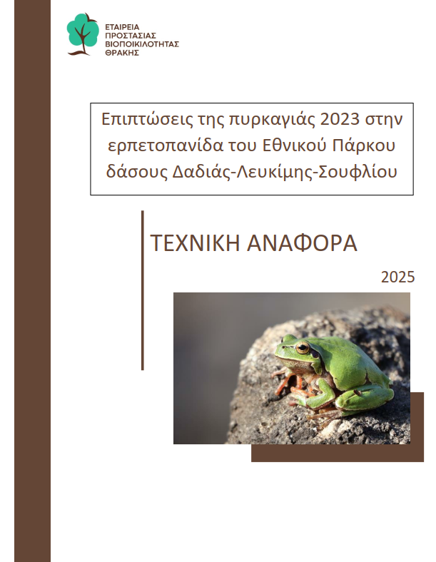 Σαγώνας, Κ., Δάφτσιος, Θ., Ιακωβίδης Δ., Γώγολος Ν., Ζαφειρόπουλος Β. και Μαραγκού Π. 2025. Επιπτώσεις της πυρκαγιάς 2023 στην ερπετοπανίδα του Εθνικού Πάρκου δάσους Δαδιάς-Λευκίμης-Σουφλίου. σελ. 35. Εταιρεία Προστασίας Βιοποικιλότητας της Θράκης. Δαδιά.
